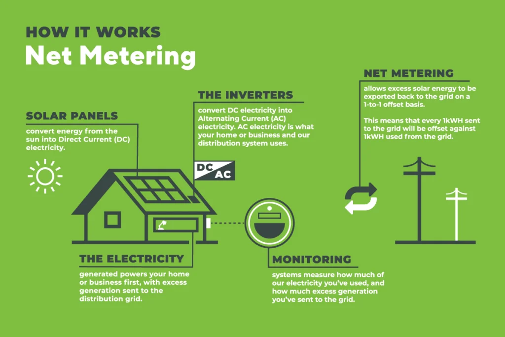 Net metering is a smart solution that allows you to share surplus solar energy with the power grid. Here’s how it works: when your solar panels generate more electricity than you need during the day, the excess power is fed back into the grid.
